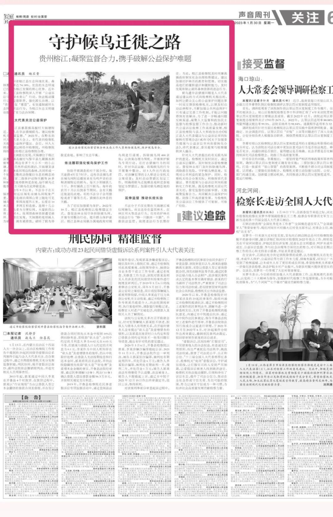 候鸟遭非法猎捕问题是人大代表通过建议的方式向检察机关提出的,如何让群众关心的公益保护问题在第一时间反馈到检察机关,以便及时启动法律程序,不断加强公共利益保护?只有通过完善工作机制,才能让问题得到有效解决。为了进一步畅通问题反映渠道,凝聚人大监督和政协民主监督与检察监督工作合力,推动新时代公益诉讼检察工作高质量发展,榕江县检察院与县人大和政协出台《榕江县人大代表建议与公益诉讼双向衔接转化管理办法(试行)》《关于加强委员提案与公益诉讼双向衔接转化办法》,将代表建议、委员提案与检察履职深入融合。