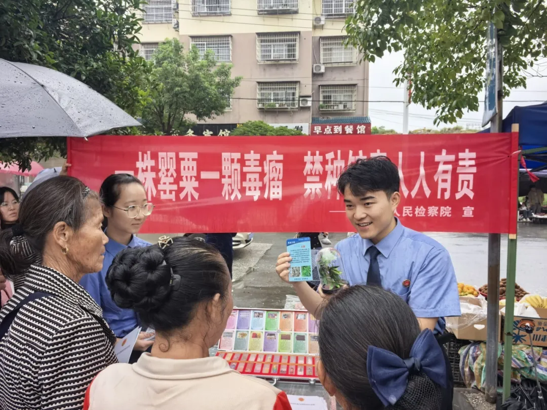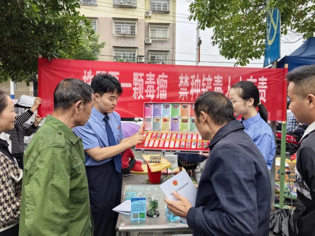 活动现场,“一株罂粟一颗毒瘤,禁种铲毒人人有责”的红色横幅格外醒目,迅速吸引过往群众驻足。检察干警通过展示罂粟、大麻等毒品原植物模型、毒品成品模型,结合办理的非法种植毒品原植物案件,直观讲解毒苗外形特征、法律危害;同时向赶集群众发放禁毒宣传手册,用通俗语言解读《中华人民共和国禁毒法》《中华人民共和国刑法》相关条款,明确“种一株也违法”的法律底线,引导群众主动举报涉毒线索,鼓励大家争当禁毒“宣传员”。