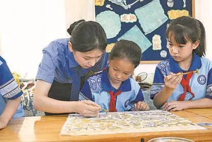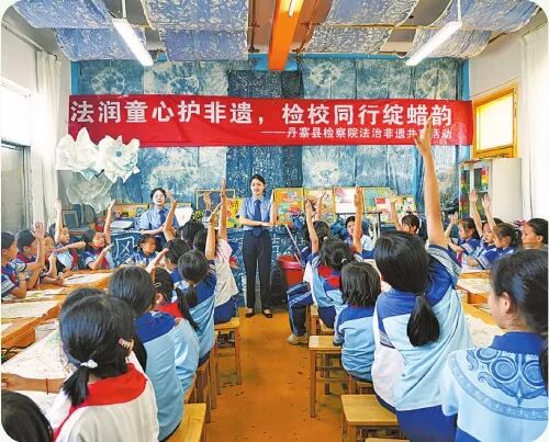 近日,贵州省丹寨县检察院组织干警走进该县扬武镇民族小学,开展“法润童心护非遗,检校同行绽蜡韵”活动。检察干警在与师生共同体验蜡染制作后,给师生讲解非遗保护的意义以及检察机关的相关职能。(本报记者林建安 通讯员邹诗蓉摄)