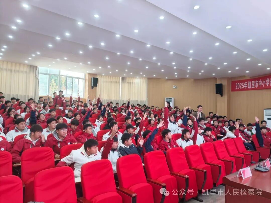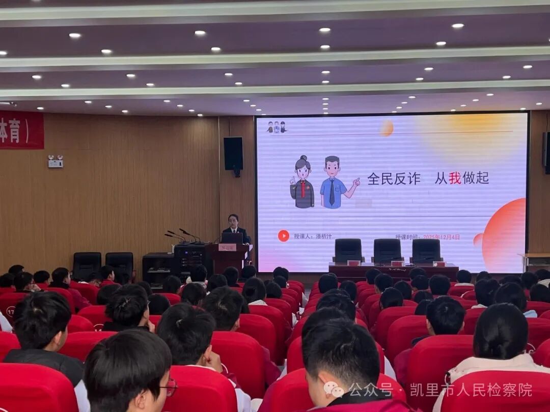 为深入贯彻习近平法治思想,落实关心下一代工作相关部署,切实强化青少年法治教育,2025年12月5日,凯里市检察院联合市关工委走进凯里市第三中学,为300余名学生带来了一场以“全民反诈 从我做起”为主题的法治宣讲课。宣讲采用“主题讲座+以案释法+互动问答”相结合的形式,助力学生筑牢反诈安全防线。