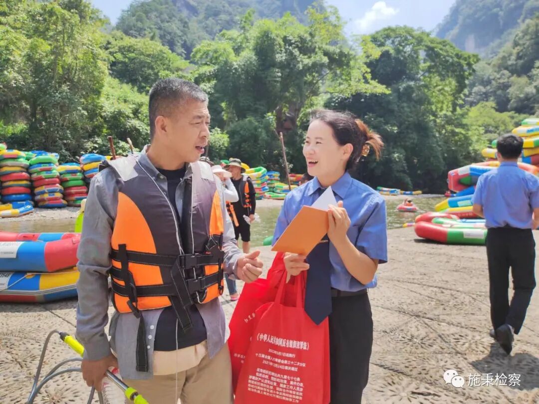 正值漂流旺季,被誉为“中华第一漂”的施秉杉木河漂流又迎来了一年一度超大流量游客接待。为进一步推进社会治安重点工作走深走实,近日,施秉县检察院干警依托旅游热点,抓住景区人流量大等特点,利用周末时间,组织干警进入施秉县杉木河漂流景区开展防盗窃、防电信诈骗等重点工作专题宣传活动。