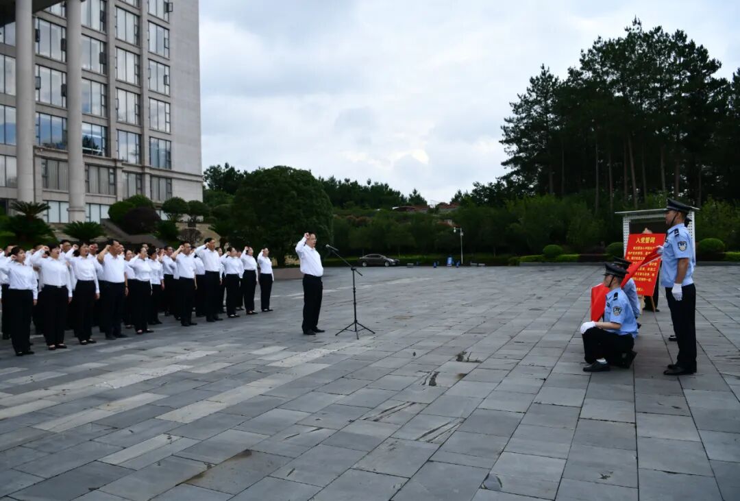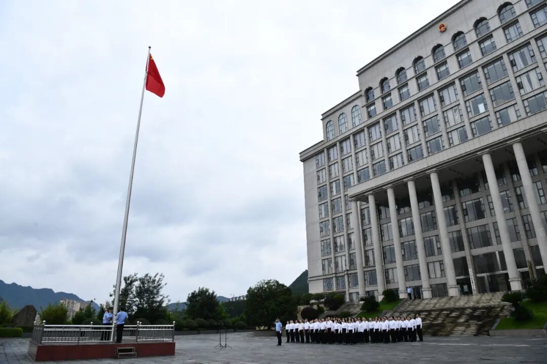 上午9点,全体干警整齐列队,参加升旗仪式,伴随着庄严雄壮的国歌声,全体肃立,面向国旗行注目礼,共庆建党103周年。