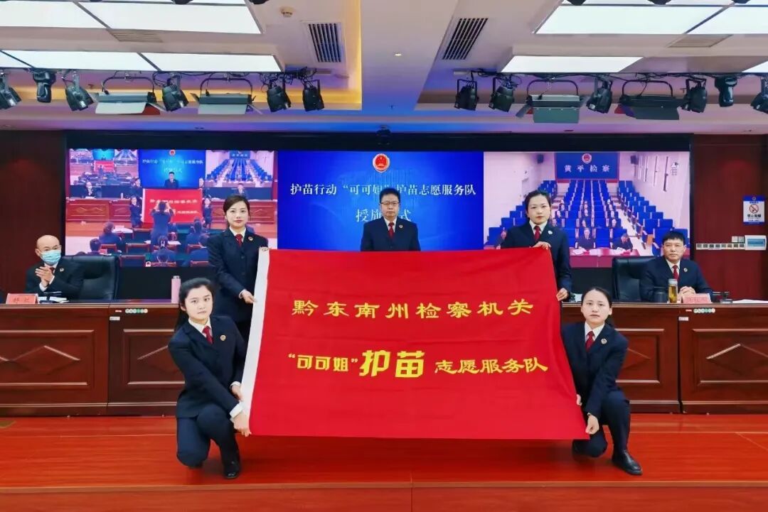 金亦贱检察长为黔东南州检察机关“可可姐”护苗志愿服务队进行现场授旗。