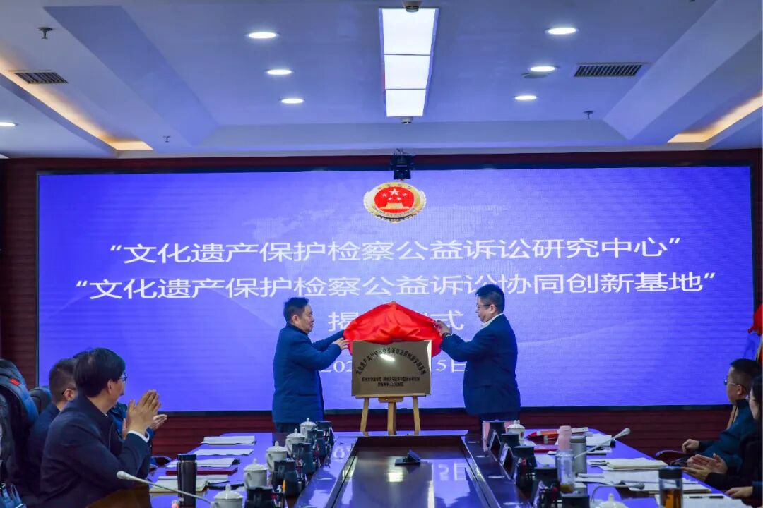 郑州大学党委常委陈曦,贵州省人民检察院副检察长姜正权共同为“文化遗产保护检察公益诉讼研究中心”揭牌