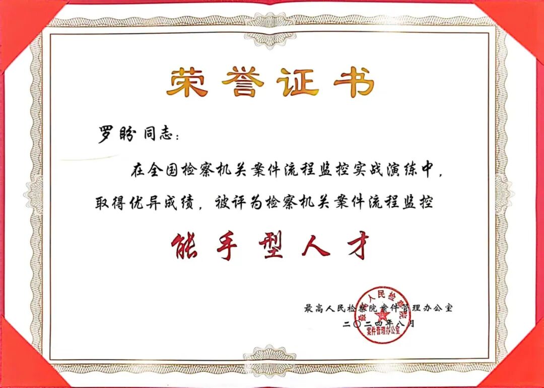 我州雷山县人民检察院罗盼同志成绩优异,荣获“全国检察机关案件流程监控实战演练能手型人才”荣誉称号。