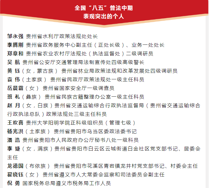 近日,《司法部、全国普法办关于通报表扬全国“八五”普法中期表现突出的单位和个人的通知》印发,对中央纪委国家监委新闻传播中心专题部等1793个表现突出的单位,1556名表现突出的个人予以通报表扬。其中,黔东南州检察院检委会委员、研究室主任舒贵获评全国“八五”普法中期表现突出个人。